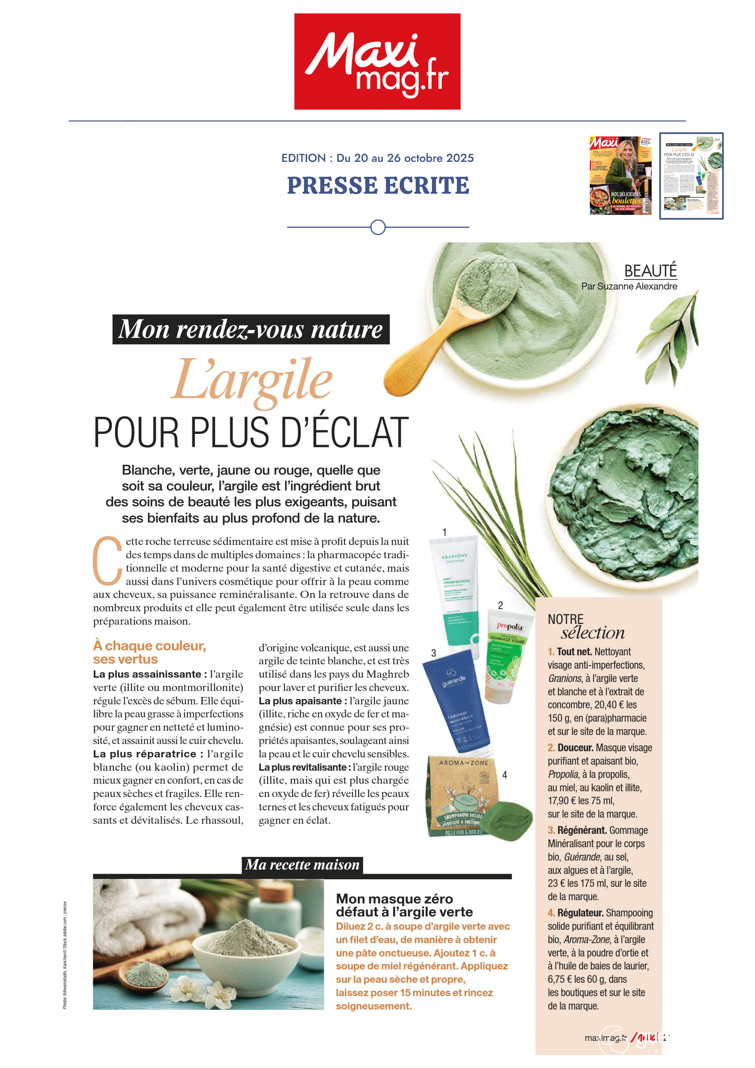 Notre univers, inspiré par les salines de Guérande et nourri par la science et le soin thalassiques, suscite curiosité et enthousiasme. Presse, radio, TV... retrouvez-ici une sélection de notre revue de presse. Chaque parution témoigne de l’intérêt croissant pour notre approche engagée, respectueuse de la peau et de l’environnement. À travers ces articles, c’est toute l’âme de notre marque qui se révèle, entre naturalité, innovation et authenticité.